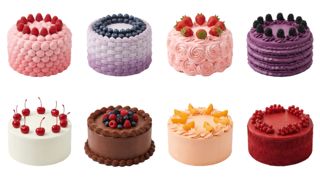 Gourmet cake set including raspberry, blueberry, strawberry, blackberry, chocolate, apricot, and redcurrant varieties. Professional bakery and dessert collection.