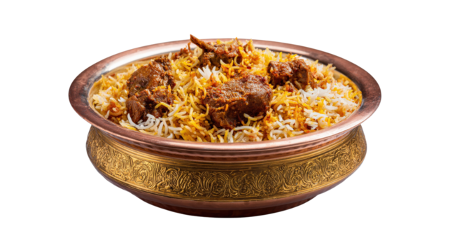 Veg biryani served in a round brass bowl isolated on transparent png