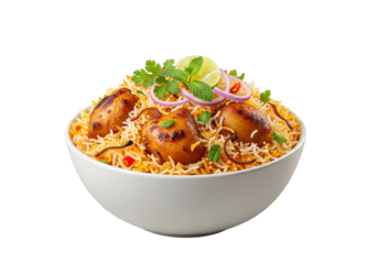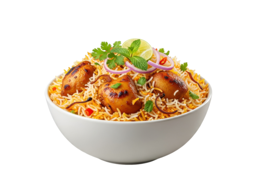 Traditional Indian chicken biryani with fragrant basmati rice and spices garnished with mint leaves served in white bowl isolated on transparent background