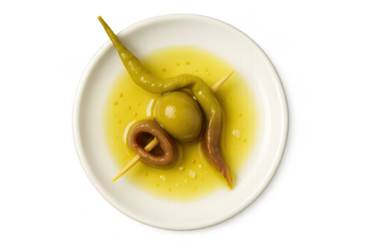 Gilda. Pincho típico del País Vasco, España, con olivas, piparra y anchoa. Imagen recortada. Fondo blanco