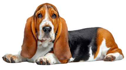 Basset hound dog lying down, isolated on transparent background