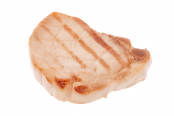 Close-up of a perfectly grilled pork cut with diagonal grill marks on transparent background