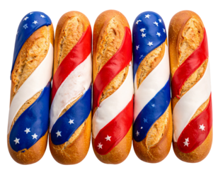 A set of festive French baguettes with tricolor icing celebrating Bastille Day, isolated on a transparent background