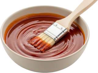 Close up view of a basting brush resting in a light colored ceramic bowl filled with rich swirling brown barbecue sauce isolate cooking condiment transparent background
