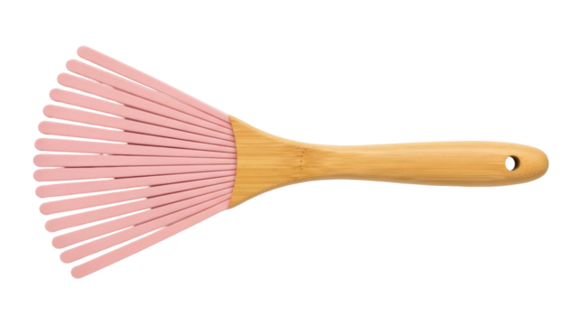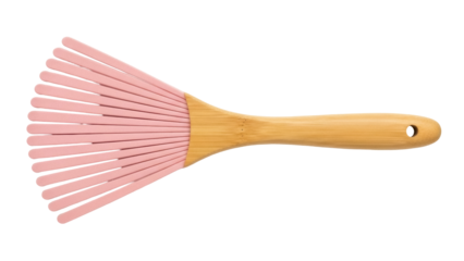 Pink silicone basting brush with wooden handle isolated PNG, kitchen utensil for baking and cooking on transparent background