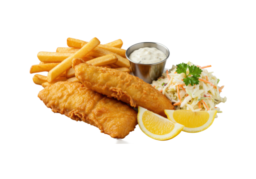 Golden-brown crispy battered fish fillets, thick-cut french fries, creamy tartar sauce, coleslaw, and lemon wedges on a white plate with copy space, studio shot, classic comfort food presentation