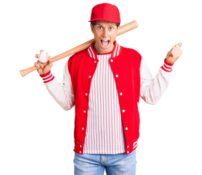 Young handsome man playing baseball holding bat and ball screaming proud, celebrating victory and success very excited with raised arms