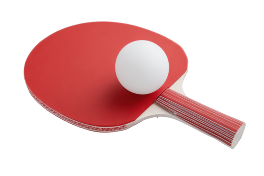 Red ping pong paddle with white ball isolated on transparent background. Red ping pong paddle and white ball ready for action isolated on white background.