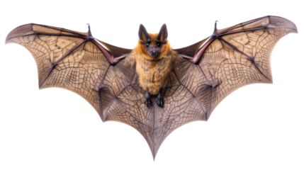 Close-up of a bat with wings spread wide, showcasing intricate wing structure and fur detail, isolated on a white background.