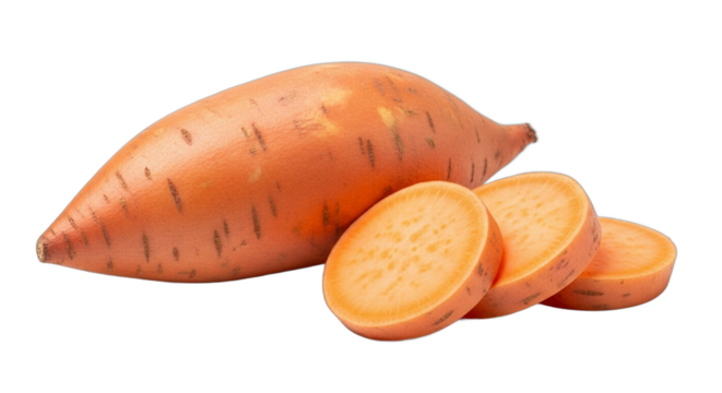 Whole raw sweet potato with several round slices isolated on a transparent background png.