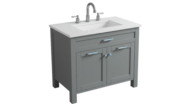Bathroom sink with modern faucet, isolated object on white background, top front angle, minimalist design, clean shadow, product display layout, side copy space