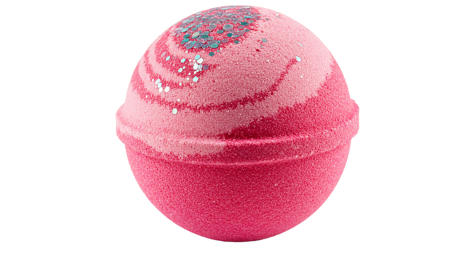 Oval shaped pink bath bomb with marbled swirls and glitter