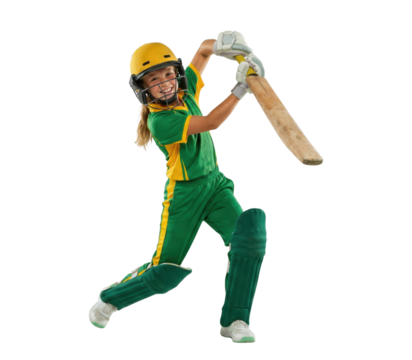 Young girl cricket player in green uniform batting isolated on white