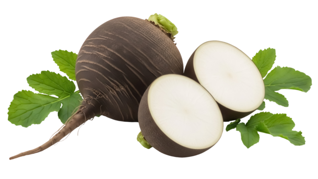 Black radish with leaves isolated PNG, whole and halved root vegetable on transparent background, healthy eating and cooking ingredient