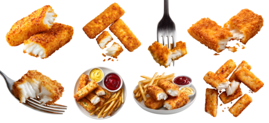 Set of fish fingers sticks, golden brown fried crispy battered crust with flaky fish fillet meat, french fries sauce dip, fork, stack broken bitten pile pieces, transparent cutout PNG. Mockup template
