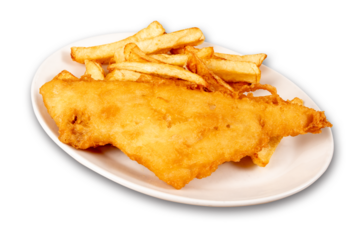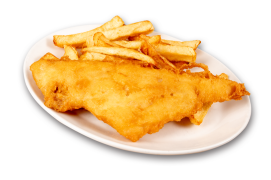 A serving of traditional English fish and chips with crispy battered fish and golden fries Isolated on transparent background PNG