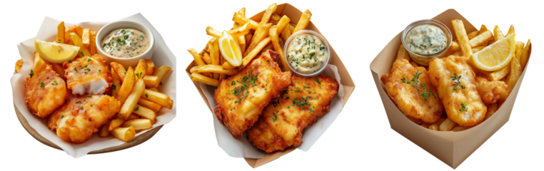 Crispy Battered Fish And Chips With Tartar Sauce. Classic Seafood Dish For Casual Dining Isolated On Transparent Background