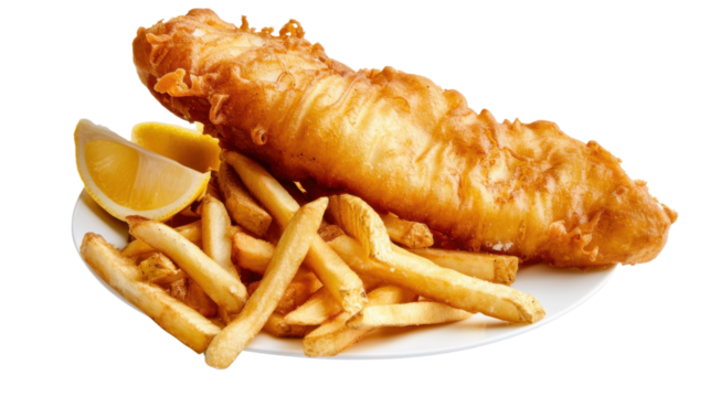 Crispy battered fish and chips with lemon wedge, a classic takeaway meal Concept of comfort food, fast food, and British cuisine