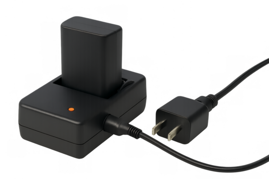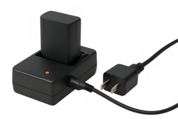 Isolated black power bank with built-in USB cable and lightning icon, portable charger
