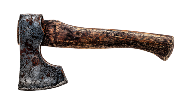 Old rust dirty dark gray axe with brown wooden handle isolated on white background with clipping path in png format