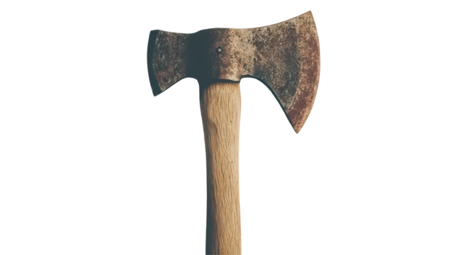 Close-up of a rustic, antique battle axe with a worn handle, isolated on a white background, ideal for historical or fantasy themes.