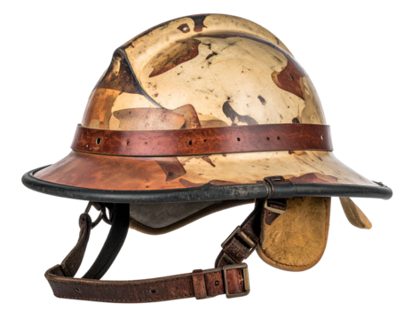 A detailed view of a military helmet featuring camouflage patterns, designed for protection and tactical operations, PNG, transparent, No background.