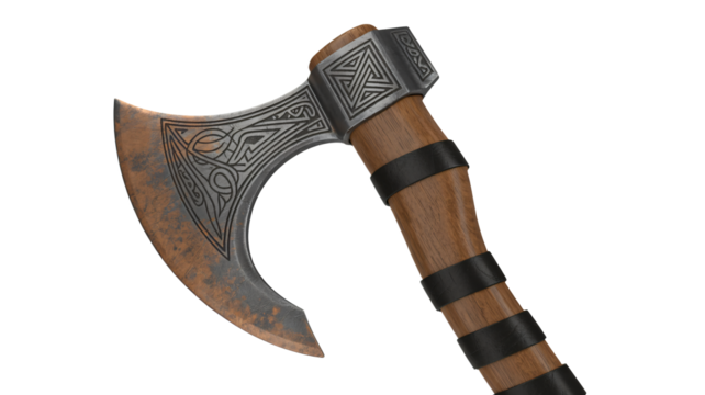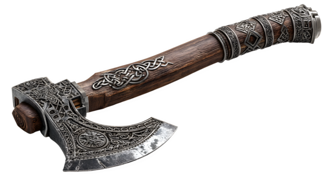 A Viking battle axe with intricate knotwork carvings on the wooden handle. isolated on white background