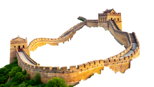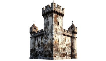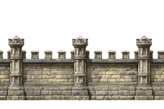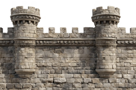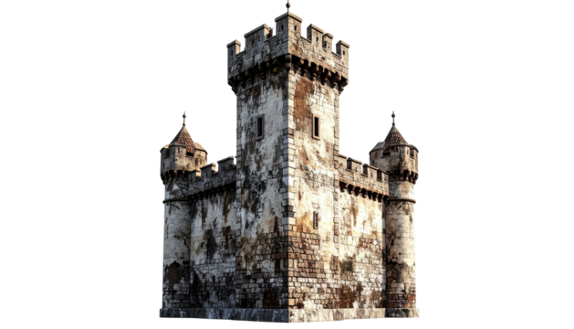 Ancient stone fortress towers and battlements castle isolated on a transparent background