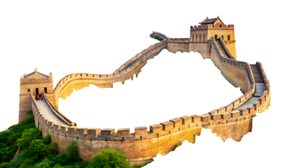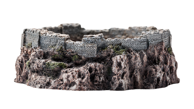 Ruined stone castle wall on a rocky outcrop isolated on transparent background