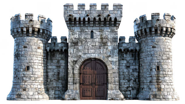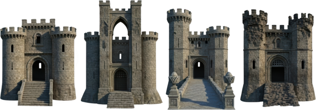 Detailed stone castle gate with four towers and an arched entrance ideal for fantasy designs on transparent background