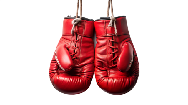Red boxing gloves hanging on a rope symbolizing fight, competition, training, strength, and sport on a transparent background