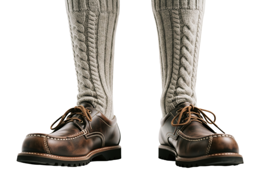 PNG cut out isolated background. A close-up detail shot of traditional Bavarian clothing for Oktoberfest, showing brown leather shoes (Haferlschuhe) and grey cable-knit wool socks.