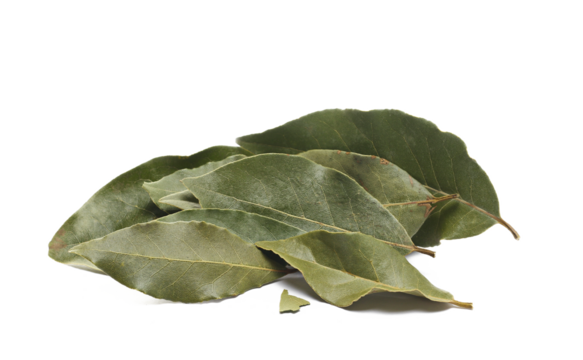 A cluster of fresh, glossy green bay leaves, isolated on a transparent background, ready for culinary use