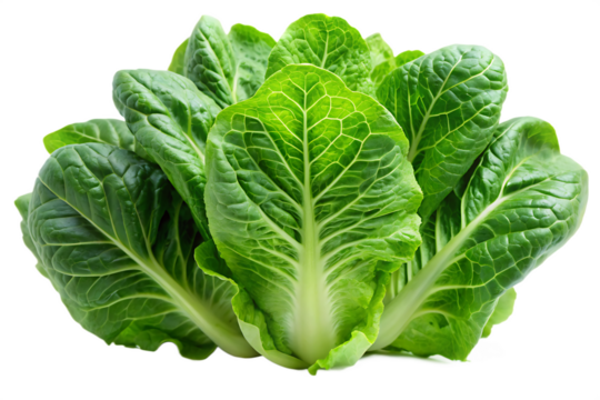 Fresh, vibrant green cos lettuce heart forming a beautiful rosette shape, isolated on transparent background