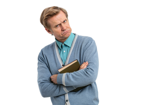 Stressed man in checkered shirt using laptop isolated on transparent background