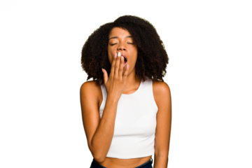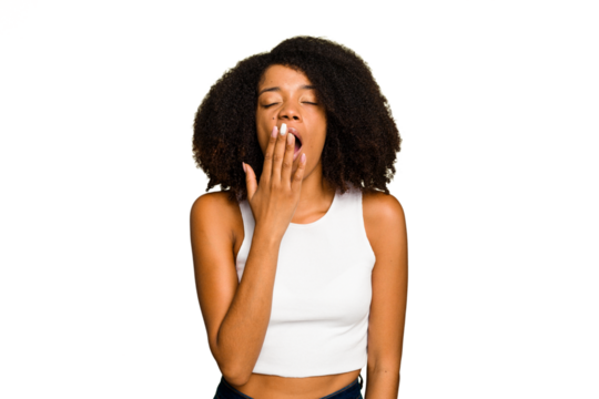 Young African American woman isolated yawning showing a tired gesture covering mouth with hand.