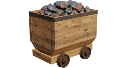 Antique wooden mine cart overflowing with gold nuggets isolated on transparent background