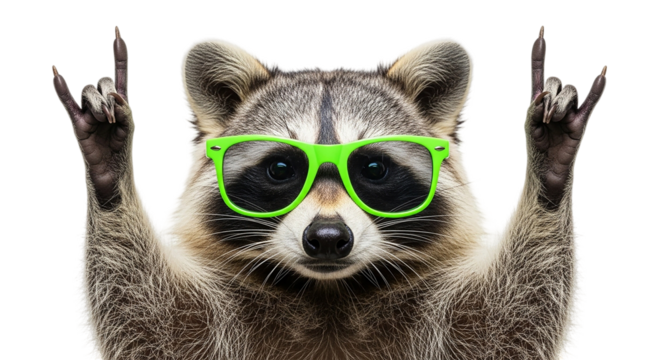 A cool raccoon rocking out with green glasses and making the rock on sign isolated against a on transparent background