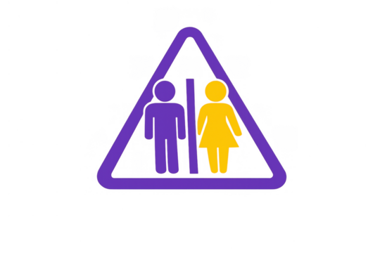 Gender neutral restroom sign representing inclusivity and equality with male and female figures in a purple triangle
