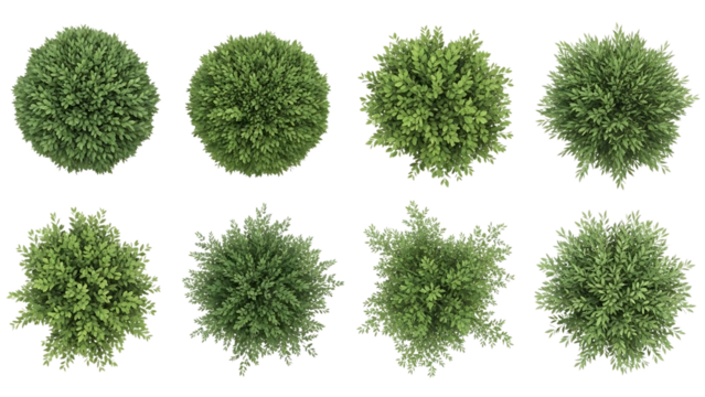 Pinus sylvestris tree plan, top view, cutout, transparent background, isolate, Three vibrant trees seen from directly above with detailed foliage and branches