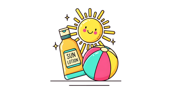 Playful summer essentials featuring sun lotion, colorful beach ball and bright