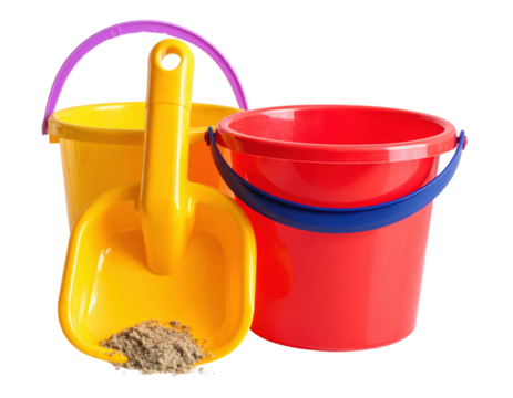 Colorful plastic beach buckets and shovel with sand for children's summer play