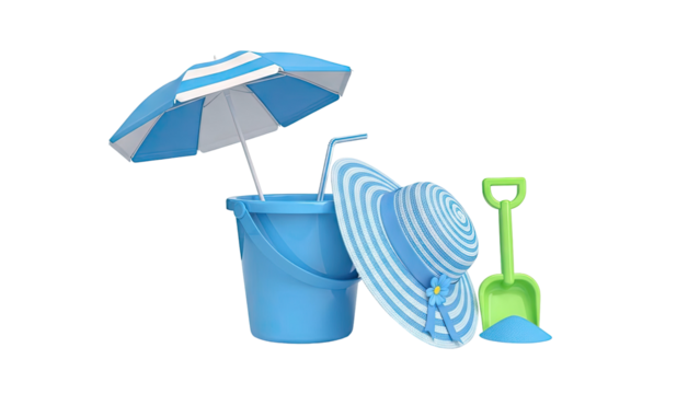 Blue Beach Accessories: Bucket, Hat, Umbrella, and Shovel with Sand