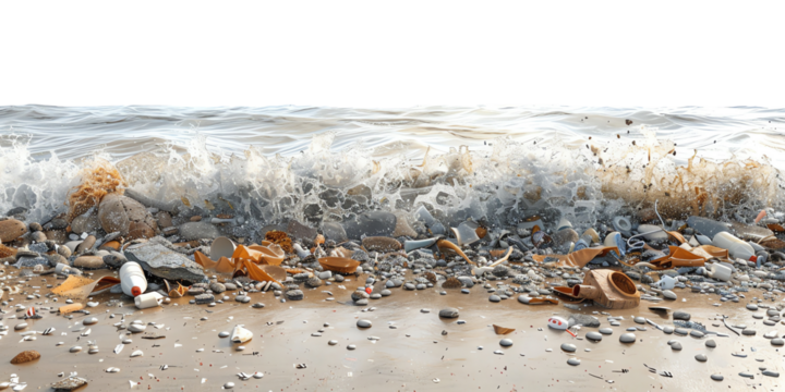 Ocean Pollution on Beach Shore, Littered with Plastic Waste and Debris, Environmental Damage, Marine Trash, Coastal Contamination, Global Warming Impact, Ecological Crisis, on Transparent Background