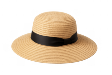 Straw boater hat with black ribbon, summer fashion accessory for sun protection and beachwear, transparent background
