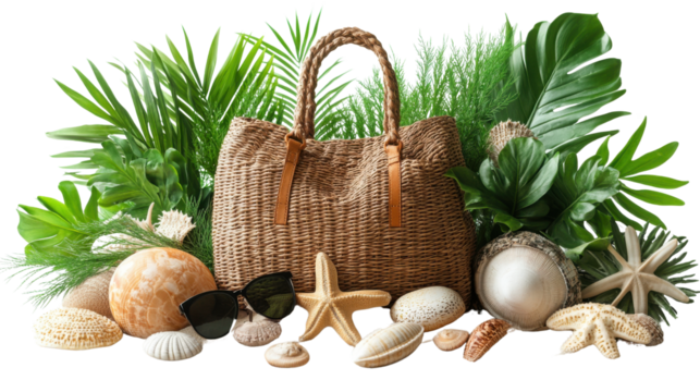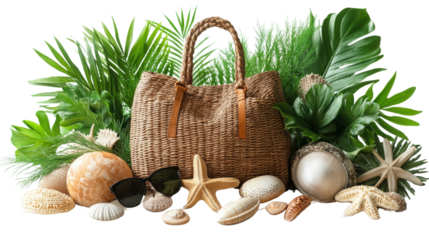 Summer vacation beach accessories and tropical fruit layout on transparent