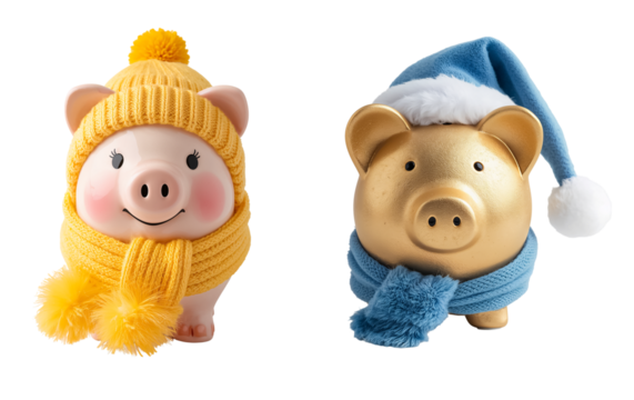 Cute cartoon adorable piggy bank in a hat and scarf isolated on transparent background