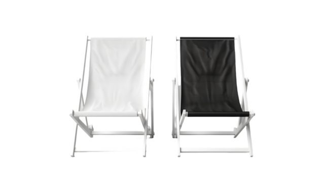 Blank black and white folding beach chair mockup, front view isolated on a transparent background
