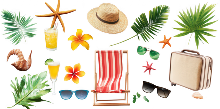 A tropical vacation scene featuring a beach chair. sunglasses. a straw hat. tropical drinks. and decorative elements like shells and flowers. evoking relaxation and summer fun