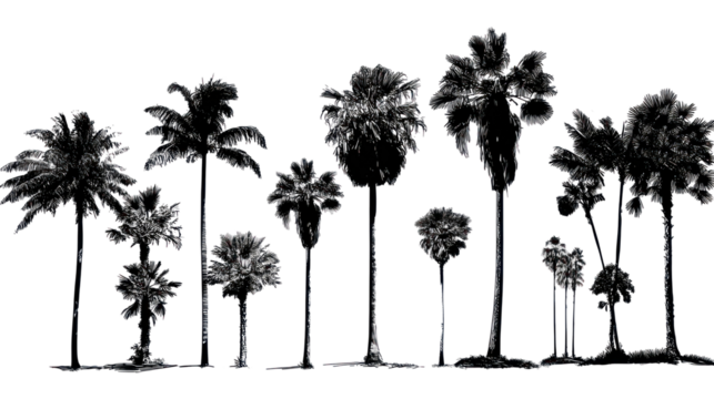 Palm trees silhouette against a vibrant tropical sunset sky, summer vacation beach concept, transparent background